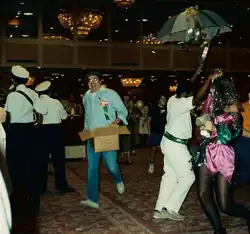 Guy Lillian carrying a box of party supplies at the opening ceremonies of Nolacon II, 1988