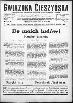 ![]() Gwiazdka Cieszyńska from 31 July 1914, featuring the manifesto of Franz Joseph at the start of World War I | |