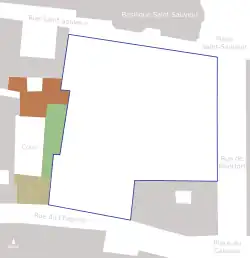 The hôtel de Blossac is located in the northwest in the secteur sauvegardé (protected area) of the historic city center. Its address and the main entrance, a porch, are at 6, rue du Chapitre. It is surrounded by rue de Montfort Street (at the east) and on the rue Saint-Sauveur (at the north). Two doors, one condemned and the other for use by staff, are arranged in the garden wall.[N 1] The western part (hôtel and service yard) is adjacent to other buildings or courses leading to deprivation. The hôtel garden offers views of Blossac the south side of the basilica of the Saint Sauveur, whereas since the floors of the hôtel it is possible to see, at the west, the nearby Rennes Cathedral.