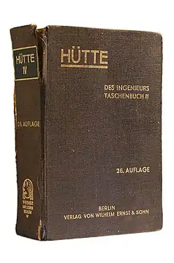 The Hütte - Das Ingenieurwissen (originally Des Ingenieurs Taschenbuch, stylized as "HÜTTE" and pronounced IPA: [ˈhʏtə]) is a reference work for engineers of various disciplines. It was compiled for the first time in 1857[2] by the Akademischer Verein Hütte (short Die Hütte, translating as "the hut") of the Königliches Gewerbe-Institut in Berlin, from which the association of German engineers Verein Deutscher Ingenieure (VDI) emerged. The authors were members of the association. The technical illustrations were created in woodcut technique by Otto Ebel. It is published in constantly revised editions to this day and is therefore the oldest German reference work still available today.[3]