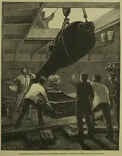 Captain Herbert Arthur Walton Onslow was in command from July 1897 to February 1902. After a refit in late 1899, she left in March 1900 for an extended recruiting cruise until August that year, visiting Portsmouth, Plymouth, Queenstown, Tarbert, Foynes, Lough Swilly, Campbeltown, Holyhead and Torbay.[5] In November 1901 she put up at Chatham Dockyard for alterations and a refit,[6] and was not finished until June the following year, when she was back as a training cruiser. Captain William G. White was in command in 1902, when she took part in the fleet review held at Spithead on 16 August 1902 for the coronation of King Edward VII.[7] Captain Arthur John Horsley was appointed in command in October 1902.[8] She was sold for breaking up in 1905 to Thos. W. Ward, of Morecambe.[4]