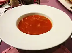 Being quite different from its Russian origin, the Chinese-style borscht (Chinese: 罗宋汤; pinyin: luósòng-tāng; lit. 'Russian soup'), originated in Harbin, close to the Russian border in northeast China, and has spread as far as Shanghai and Hong Kong.[8] A Shanghai variety appeared when the Russian emigres settled down in the former French Concession in the early 20th century. The recipe was changed by removing beetroot and using tomato paste to color the soup as well as to add to its sweetness, because Shanghai's climate was bad for planting beets and the soup's original sour taste was alien for the local people. Later, cooks usually fried the tomato paste in oil to reduce its sour taste, then put white sugar in the soup to make it both sour and sweet. Alternatively, pre-sweetened ketchup can be used instead. Likewise, cream is replaced by flour to generate thickness without inducing sourness. Most recipes contain beef and its broth, potatoes, and leaf vegetables; Hongchang sausage and Worcestershire sauce are sometimes added as well. As more people made borscht at home, its recipes changed to please the different tastes of its makers, occasionally taking on the influence of mirepoix or minestrone with the inclusion of carrots, celery, onions, and bay leaves. The soup is often accompanied by rice.[9]