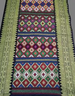 Women of this tribe chiefly wear pathin,[11] a wrap-around skirt that covered the upper and lower part of the body from the bust till the calf of the leg. Women in the upper class wore a long pathin which fell down to the floor while women in the lower class wore a shorter pathin which length reaches to the ankle. The pathin is a horizontally striped, colourful, rectangular piece of cloth with alternate layers of different colours between red stripes and thick horizontal borders. The pathin, also called pate or pâthni, consists of two main sets of stripes: the kan and the gao. If the pathin is observed with the stripes parallel to the horizon, the kan appears to be on the top and bottom ends of the pathin, while the gao is the larger central portion of the pathin. Red is the main colour used in the rangapathin, which is worn by young women; while middle-aged women tend to wear pathins with lesser stripes in shades of green. Women, while working on the fields use the kompes as a banong or belt. The compes is a brocaded scarf mostly used by men, but often women use it to tie their waists. Menfolk wear a woven piece of cloth called ningti or bhijâ kapur, it is worn in the fashion of a dhoti. During winters, both men and women cover their bodies with a traditional brocaded shawl called Argon[11] and men keep their necks warm with a kompes. Other kind of clothes used by the Hajongs are gamsa similar to the Assamese gamosa and pasra, an embroidered light shawl. Buksuli is the traditional shirt used by men.