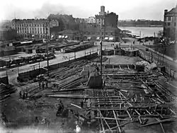 The final blueprints for the market hall were made in June 1912. The blueprints bear the signatures of both Einar Flinckenberg and city architect Karl Hård af Segerstad who served as the city architect of Helsinki from 1907 to 1921, but Flinckenberg was seen as the main architect of the building.[5] In 1912 the support beams, foundation and stone layout of the market hall building were made. After a workers' strike had stopped the construction autumn had already progressed so far that masonry work could not be started. In the next year the market hall was completed except for its interior. The market hall, which was hailed as the largest and most modern in all of Europe, was opened on 1 June 1914. On the same day, sales of food and cloths at the Hakaniemi market square were forbidden, only sales of "common products for the people" and salted fish were allowed. The space thus vacated at the market square was filled with the transfer of sales of hay from the Hietalahdentori market square.