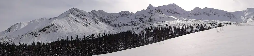 A yellow trail branches left from the Murowaniec mountain hut to Krzyżne pass through Pańszczyca Valley. This trail is relatively easy, with one challenging section near a rocky outcrop on the steep ascent to Krzyżne.[3] Above the mountain hut lies a weather station, the first high-mountain weather station in Polish territory,[4] operating from 1 December 1913 to 1917 as a measurement station for the Natural Sciences Section of the Polish Tatra Society. It is now the Maria and Mieczysław Kłapa Research Station of the Institute of Geography and Spatial Organization of the Polish Academy of Sciences.[5]