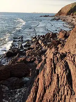 Resistant rock strata exposed on the wave-cut platform below Black Cliff, looking north.