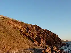 From around 550 Ma the beds of the Geosyncline began a series of intraplate extensional and contractional events. The beds began to buckle, fold, uplift and block fault, creating a range of mountains called the Delamerian Highlands, possibly up to 8 kilometres (5.0 mi) in height.[10] Almost immediately the mountain range began eroding heavily and this process continued for another 200 Ma. The Precambrian rock of Black Cliff and the wave cut platform at Hallett Cove are all that remains of the base of the mountain range in this area and clearly shows complicated folding with several small faults visible. Erosion has removed rock dated less than 570 Ma, but younger overlaying rock (570 - 500Ma) is exposed further south between Sellicks Hill to Normanville. Cambrian fossils have been found in these younger rocks while no fossils have been found in those remaining at Hallett Cove.[5][11]