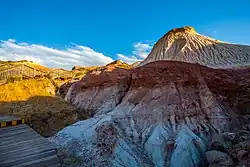 The Amphitheatre is a feature of the park where the Precambrian rocks are below sea level. Without their protection erosion is rapidly cutting through the soft Permian, Pliocene and Pleistocene deposits resulting in a badlands terrain. As the silts are eroded erratics are released which roll down to the base platform and beach.