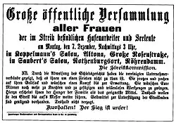 Another factor in the organisation of the strike was the targeted appeal to women at mass rallies organised specifically for this purpose. The aim was to prevent conflicts within families and thus prevent the strike front from crumbling. This tactic was still relatively new in the context of labour disputes and, in retrospect, proved successful from the officials' point of view. Luise Zietz, who had herself been an activist at meetings of women dockworkers, praised it at the SPD party conference held in Hamburg in October 1897.[5]