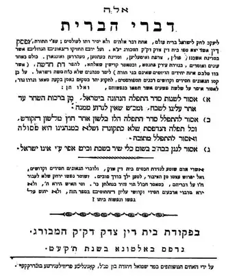 Liebermann added Chorin and Kunitz's letters to those of Samun and Recanati, from which he removed the dates and openings that indicated they were from 1816.[22] He published the four in a compendium titled "Radiance of Justice" ("Nogah ha-Tzedek"). He also authored a long concluding chapter, "Radiant Light" ("Or Nogah") where he denounced the rabbis of his day. Liebermann mixed enlightened notions with quotes from nonconformist Jewish medieval philosophers, especially Leon of Modena. He attacked decisors for demonstrating legalistic rigidity, arrogance and apathy as many of the young turned away from religion.[23] A minor point he made was justifying less mourning and prayers about the Jerusalem Temple, arguing these also constituted Hastening the End.[24] He did not spare common Jews either, blaming them for neglecting their children's religious education. Liebermann determined that some prayers should be recited in German, but only where people were ignorant of Hebrew.[25]