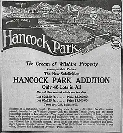 8. ^ "History of Hancock Park Goes on View With Tour". Los Angeles Times. September 20, 1987. p. 147. Retrieved December 30, 2023. & "Hancock". Los Angeles Times. September 20, 1987. p. 154. Retrieved December 30, 2023.