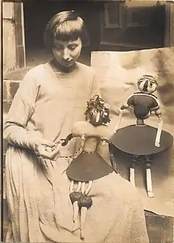 From an Ethnographic Museum (1929), one of Höch's most ambitious and highly political projects, is a series of twenty photomontages that depict images of European female bodies with images of African male bodies and masks from museum catalogues, creating collages that offer "the visual culture of two vastly separate civilizations as interchangeable—the modish European flapper loses none of her stylishness in immediate proximity to African tribal objects; likewise, the non-Western artifact is able to signify in some fundamental sense as ritual object despite its conflation with patently European features."[31] Hoch created Dada Puppen (Dada Dolls) 1916. These dolls were influenced by Hugo Ball, the Zurich-based founder of Dada. The doll's costumes resembled the geometric forms of Ball's own costumes worn in seminal Dada performances.[19]
