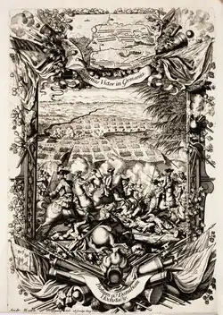 In 1705 Platen fought on the Upper Rhine and in 1706 on the Lower Rhine.[2] In 1707 he was promoted to major and fought the following year in the Battle of Oudenaarde. He participated in the conquests of Lille and Ghent as well as in Mons. In 1709 he fought in the decisive Battle of Malplaquet. There, he impressed Frederick William, then the Prussian crown prince, who introduced him to the king and rewarded him with estates at Putzermin and half of Fritzow. Platen fought in 1710 at Douay, Bethune, and Aire and, in 1711, at Bouchain. He remained in Holland until the Peace of Utrecht.[1]