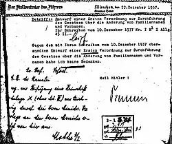 In 1936, Globke wrote a legal annotation on the antisemitic Nuremberg Race Laws that did not express any objection to the discrimination against Jews, placing the Nazi Party on a firmer legal ground and setting the path to the Holocaust during World War II.[4][5] By 1938, Globke had been promoted to Ministerialdirigent in the Office for Jewish Affairs in the Ministry of the Interior, where he produced the Name Change Ordinance, a law that forced Jewish men to take the middle name Israel and Jewish women Sara for easier identification.[5] In 1941, during the Nazi period, he issued another statute that stripped Jews in occupied territories of their statehood and possessions.[5] Globke was identified as the author of an interior ministry report from France, written in racist language, that complained of "coloured blood into Europe" and called for the "elimination" of its "influences" on the gene pool.[5]