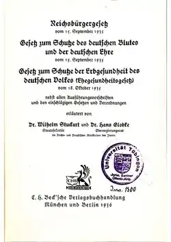 Globke was responsible for preparing legal commentaries and explanations for his areas of responsibility. In 1936, together with his superior, State Secretary Wilhelm Stuckart, he published the first commentary on the Nuremberg Laws and their implementing regulations. This proved to be particularly influential for the interpretation of the Nuremberg Laws because it was given an official character. Originally, Globke was only supposed to comment on matrimonial issues as Stuckart wanted to do the rest of the work himself, but Stuckart became ill for a long time, so Globke wrote the commentary on his own. Stuckart ended up only writing the extensive introduction.[23] In this context, Globke's later defense lawyers pointed out that he was not to be held responsible for Stuckart's racist choice of words and that his commentary on the law interpreted the Nuremberg Laws narrowly in comparison to later comments. In individual cases, especially in the case of so-called mixed marriages, this has proven to be beneficial for those affected.[24]