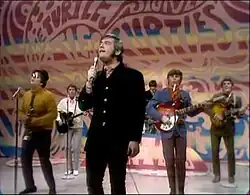 "Happy Together" was released as a single in January 1967, backed with the Warren Zevon-penned "Like the Seasons".[45][46] To promote the single, the band members performed in a couple of shows, including The Smothers Brothers Comedy Hour in February.[47][48] The Turtles would be called to perform on The Ed Sullivan Show on May 14, 1967,[49] and again, as a quintet, on November 12 (Tucker had left for personal reasons).[50][51] During this time, Douglas had left the Turtles to produce the Monkees.[33] His replacement was Jim Pons, formerly from the Leaves.[23] With Pons, they participated in a film shot in March that consisted of "the group running, jumping, rolling and mugging in a park in Los Angeles". Guitarist Tucker said in an interview that the park location was possibly Griffith Park.[52][53]