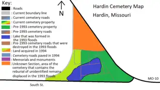 Hardin and its cemetery were affected by the Great Flood of 1993, due to their location near the Missouri River. On July 12, 1993 a levee protecting the town of Hardin broke, flooding the city and the cemetery. The flood waters cut a pond thru the cemetery and swept away 793 burials. Later, under the leadership of Dean Snow, 645 remains were recovered, but most were unidentified. Some were still inside their vaults or caskets (thus helping making identification easier), while others were scattered in the open. Since DNA testing was still in its infancy, bodies and bones had to be identified by the rate of decay, sex, age range, dental records and family recollections. Of the bodies recovered, only 120 were identified and reburied with their original headstones. The remaining 525 bodies were unidentified. Some had decayed to the point that they were unrecognizable, others were too old to have any surviving records or relatives. The unidentified bodies were reburied in a mass grave in part of a 9.5 acre plot of land that was purchased by the cemetery after the 1993 flood. The unidentified were marked with a headstone listing them as unknown and a number, so in case the bodies were to be disturbed again by another flood or if authorities wanted to try to identify them with newer technology or DNA testing in the future. A memorial was added to the western entrance of the cemetery in 1994 to honor the 1993 flood and the unidentified bodies. Part of the newly acquired acre of land was also used to display the recovered headstones of those whose bodies were not identified. They today function as a Cenotaph for the unidentified bodies so living family members can still pay respects. The rest was used to rebury the 120 identified bodies and for new burials. In 1995, a second memorial was added near the mass grave displaying the names, birth and death years of the displaced bodies that could not be identified. Today, the cemetery is 18.5 acres large, including the pond.[8][9][10]