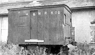The railroad company’s charter allowed it to suspend service in the winter,[17] and the front page of the local freight tariff always included a notice that carriage was "subject to the right to suspend operations upon statutory notice" from December through March.[1]: 53–54 However, the railroad did not close for the winter throughout its operation[1]: 54 although there were some shorter closures late in its existence.[26]: 22 As a result, snow was an issue for the railroad.[18] The railroad's first snowplow was built by the railroad’s first engineer; it had to be removed and attached to the other end of the locomotive at each switchback.[6]: 25 Around 1900, this plow was replaced with a plow obtained from a timber railroad. This proved unsatisfactory, and a second-hand plow was bought from the St. Johnsbury & Lake Champlain when that railroad obtained a new one. This third plow served the H&W for the rest of its existence.[6]: 25 For lighter snowfalls, the railroad had a "flanger", designed by a conductor and built in Lyndonville. It was built on a single long truck and was quite effective.[1]