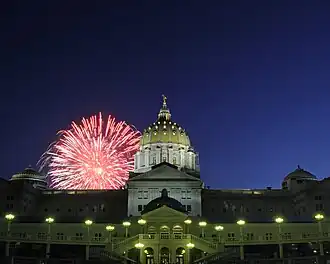 ![]() Fireworks display seen behind the Pennsylvania State Capitol | |