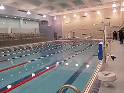 When it was built, the school housed two indoor swimming pools. An Olympic-sized competition pool, which had been closed since 1995 due to eroded pipes was reopened in January 2012. An adjacent shallow training pool, also in disrepair, was not fixed due to a lack of sufficient funds. It is now hidden from view behind a wall built during the renovation.[40][41][43][44]
