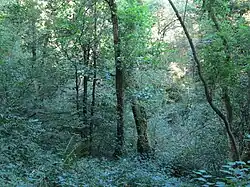 Existing for over 400 years, the wood is ancient woodland. It was once coppiced to supply timber for charcoal making. There are mostly ash trees; other species include hazel and oak; also small-leaved lime, which, seldom producing viable seeds in Britain, is only found in long-established woods. In waterlogged places there are areas of alder carr.[2][1]