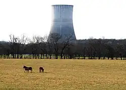 The site today remains abandoned. A few small buildings were demolished, but the main structures remain intact. The Tennessee Valley Authority sold 550 acres (220 ha) of the 1,940-acre (790 ha) of the Hartsville site to the Four Lake Regional Industrial Development Authority for $1.7 million to form the PowerCom Industrial Center.[10][11] In August 2002, a uranium enrichment facility was proposed to be constructed on the site of the power plant to be operated by Louisiana Energy Services.[12] It secured a backing of $1.1 billion (equivalent to $1.92 billion in 2024)[13] but the location was quickly changed in mid 2003 due to public opposition.[14] The site location would be changed to New Mexico and is now the National Enrichment Facility. The Trousdale Turner Correctional Center, a private prison operated by CoreCivic, began operations on the site in 2016. TVA currently has plans to demolish the single cooling tower some time in September, 2025.[15]