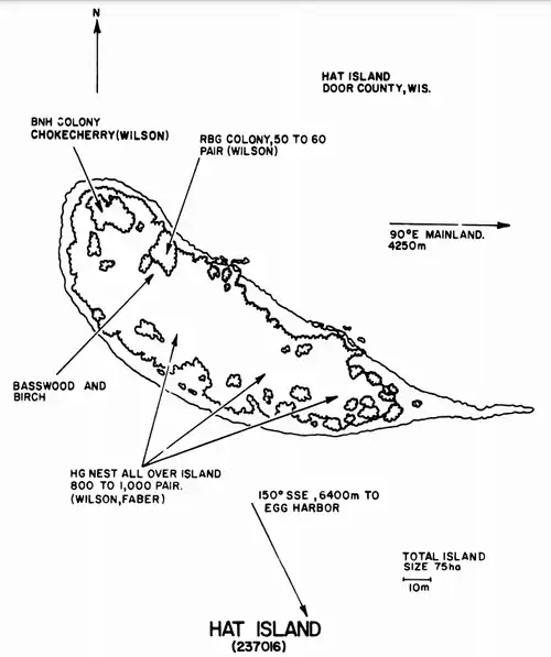 • Figure 15. Hat Island, in Colonial birds nesting on man-made and natural sites in the U.S. Great Lakes by William C. Scharf, Northwestern Michigan College, Traverse City, Michigan, published by Vicksburg, MS: Waterways Experiment Station, 1978