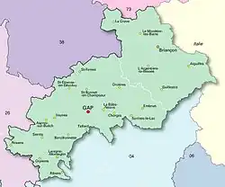 Hautes-Alpes (French pronunciation: [ot.z‿alp] ⓘ; Occitan: Auts Aups; English: Upper Alps) is a department in the Provence-Alpes-Côte d'Azur region of Southeastern France. It is located in the heart of the French Alps, after which it is named. Hautes-Alpes had a population of 141,220 as of 2019,[3] which makes it the third least populated French department. Its prefecture is Gap; its sole subprefecture is Briançon. Its INSEE and postal code is 05.