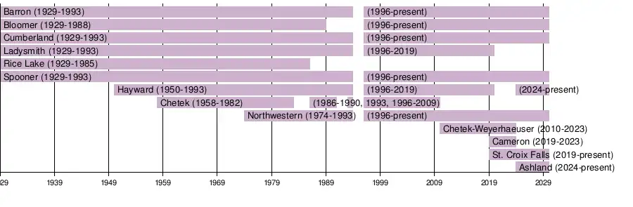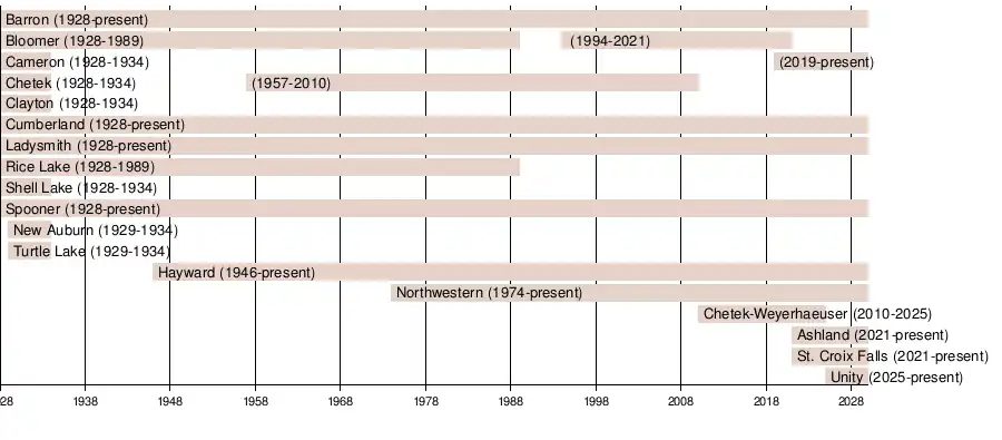 After Northwestern joined the Heart O'North in 1974, the conference continued with a nine-member roster for fifteen years, until Bloomer and Rice Lake left in 1989. Bloomer joined the Middle Border Conference,[8] and Rice Lake became members of the larger Big Rivers Conference as an all-sport member[9] (they had previously been football-only members since 1986).[10] After five years in the Middle Border, Bloomer rejoined the Heart O'North Conference in 1994.[11] That same year, the Heart O'North briefly ended football sponsorship to join the Northwest Football League along with members of the Middle Border and Dunn-St. Croix Conferences.[12] This arrangement would last for two seasons, after which the conference resumed sponsorship of interscholastic football.[13] Membership remained stable until 2010, when Chetek High School merged with Weyerhaeuser High School of the Lakeland Conference to form the new Chetek-Weyerhaeuser High School.[14] The new school inherited Chetek's place in the Heart O'North Conference.[15] In 2019, Cameron rejoined the Heart O'North after leaving the conference eighty-five years ago to help form the Lakeland Conference, which they were still members of at the time of their exit.[16] Two years later, the Heart O'North Conference accepted two new members and bid farewell to a longtime member. Bloomer exited the conference for a second time in 2021, this time to join the Cloverbelt Conference.[17] Ashland and St. Croix Falls became Heart O'North members that same year; St. Croix Falls joined from Lakeland Conference[18] and Ashland were previously members of the Minnesota-based Lake Superior Conference.[19] Chetek-Weyerhaeuser left the Heart O'North in 2025 to join the Dunn-St. Croix Conference and were replaced by outgoing Lakeland Conference members Unity.[20]