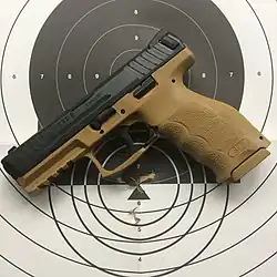 The Heckler & Koch VP9 (known as SFP9 in Europe and Canada) is a polymer-framed semi-automatic striker-fired handgun. The VP designation in the name refers to Volkspistole, which translates to “civilian pistol” (literally “people’s pistol” [4]) while SFP stands for "striker-fired pistol".[5] The 9 stands for the caliber designation of 9 mm. The VP9 is the third striker-fired pistol that HK has produced. A variant of the VP9, the VP40, is chambered for .40 S&W; the VP40 is known as SFP40 in Europe and Canada.[5]