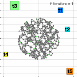 This figure shows how each of 320 robots makes a decision in terms of which task it has to work with whom, by using the decentralised algorithm in.[29] Here, each circle represents each robot, and the lines between them represent the communication network of the robots. Each square and its size indicate each of the given tasks and its task demand, respectively. The final result is a Nash-stable partition, where the robots form task-specific coalitions.