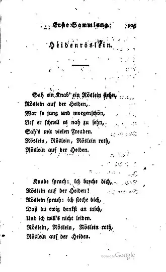 1. ^ Goethe, Johann Wolfgang von (1789). "Heidenröslein". Goethe's Schriften. Vol. 8. Leipzig: Georg Joachim Göschen. pp. 105–106.