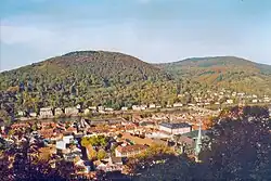 The mountain rises above the Heidelberg neighbourhoods of Neuenheim and Handschuhsheim. The Philosophers' Way leads up the mountain from Neuenheim for about 2 kilometres (1.2 mi).