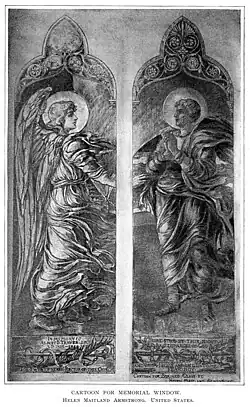Armstrong's oeuvre centers on stained glass windows for churches but also includes mosaics, murals, and illustrations.[4] The stained glass she created both solo and in business partnership with her father until his death in 1918 is considered among the finest in late 19th and early 20th century America, ranking alongside the work of Louis Comfort Tiffany and John La Farge, both of whom were friends of Armstrong and her father.[1] She is a member of the first generation of women artists to take advantage of the new stained glass techniques pioneered by La Farge and Tiffany, along with Lydia Field Emmet and her sister Rosina Emmet Sherwood.[7] Her earliest work dates from the 1890s; in 1893, a cartoon for one of her stained glass windows was shown in the Women's Building at the World's Columbian Exposition in Chicago.[8]
