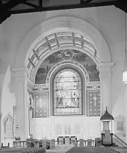 East window of Old St. Paul's Episcopal Church, Baltimore, Maryland, by Helen Maitland Armstrong, above reredos by Louis Comfort Tiffany, photographed after 1933. The window depicts the glorification of God and was installed ca. 1904.