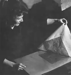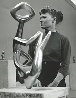 Helen Elizabeth Phillips, also known as Helen Phillips Hayter (March 3, 1913 – January 23, 1995[1] ) was an American sculptor, printmaker, and graphic artist active in San Francisco, New York, and Paris.[2] During her life, she contributed to various avant-gardes of the 20th century, with a personal, de-conditioned vision, which evolved from the surrealist practices the 30s to the adoption of a repeated geometric unit to express the three-dimensional movement in sculpture. Her biomorphic, hermetic imaginary, her use of positive and negative spaces in both sculpture and printmaking, and her strong, pure color, opened new paths in artistic expression.