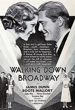The script was based on the unproduced play Walking Down Broadway by Dawn Powell.[1] According to Fox staff writer Leonard Spigelgass, who assisted von Stroheim with the screenplay, the director "was chiefly interested in the neuroses" of the film's characters, who had been changed from "simple American characters into far more complicated ones, Viennese-oriented".[1] Producer Sol M. Wurtzel urged von Stroheim to implement Wurtzel's idea of introducing the idea of marriage between the characters at the very beginning of the film to make them more "sympathetic".[1] The final shooting script was filed on August 9, 1932, with the subtitle "An inconsequential story concerning small people along The Great White Way".[1]