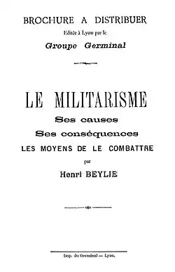 • Beylie, Henri (1903). Le Militarisme, ses causes, ses conséquences, les moyens de le combattre. Lyon: Groupe Germinal. p. 8.