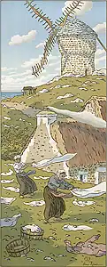Between 1882 and 1886 Rivière created a large number of etchings. He also showed an interest in photography, making a series of picturesque scenes of everyday life.[5] He later experimented with colour woodcuts and chromolithography in the late 1880s. Rivière first visited Brittany in 1884, spending most of his summers there until 1916. Together with bustling Parisian life, rural Brittany constituted the majority of the subjects of his landscape works.
