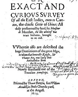 - Henri de Feynes An exact and curious suruey of all the East Indies, euen to Canton 1615, London [1]