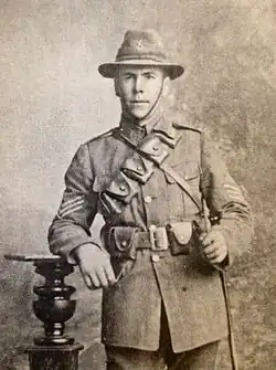 Dewar enlisted early, joining the New Zealand Expeditionary Force leaving on 15 August 1914 for German Samoa.[31][32] On his return he volunteered again, joining the 9th Wellington Mounted Rifles as a machine gunner and was based at Awapuni Racecourse, Palmerston North; he was promoted quickly to sergeant. On 16 October 1914, after training, Dewar embarked on the Orari at Wellington en route for Egypt.[33] There, Dewar captained the Wellington Mounted Rifles rugby team in several matches against other regiments — beating the First Australian Light Horse, the Canterbury Mounted Rifles, and the Auckland Mounted Rifles[34] — before his regiment landed on 8 August 1915 at Anzac Cove, Gallipoli.[4][35] Twenty-four hours later, on 9 August 1915, Dewar lost his life in the assault on Chunuk Bair — Albert Downing was killed in the same action, the first All Black to be killed in the war. Sergeant Henry Dewar is commemorated on the Chunuk Bair (NZ) Memorial Turkey (Panel 4).[35]