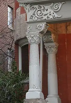 Squat Romanesque columns with foliated capitals are seen on the porch of the house.