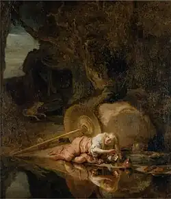 Its present title was given in a 2004 catalogue of the Museum's collections due to the presence of peacocks, which are associated with Hera. The longer version of the title refers to her being sent to the home of Oceanus and Tethys by her mother Rhea during the Titanomachy. However, it is unclear if this interpretation is correct, as it does not explain why she is interrupted while combing her hair or why she does not appear to be near the ocean. In 1883, the painting was thought to depict Narcissus, but this interpretation also falls short, as it does not account for the presence of the peacocks, the running quadruped, or why the figure looks up from the water rather than gazes at their reflection.