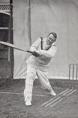 When Hewett was named as one of the Five Batsmen of the Year by Wisden Cricketers' Almanack in 1893, the publication described him as "the finest left-handed batsman in England".[5] He played in an unorthodox but attractive fashion, which prompted W.G. Grace to praise "his dashing and fearless hitting", while remarking that he had an awkward style.[11] In Somerset, Cider and Sixes, David Foot described that he was "possessed of an eagle eye, considerable meat and the ability to make his forcing shots attractive."[101] In Peter Roebuck's From Sammy to Jimmy, he offered a similar portrait of Hewett's batting style, adding that "he saw it as his task to conquer".[102] Hewett's batting received praise in H. S. Altham and E. W. Swanton's A History of Cricket, where he is described as a "singularly determined and venomous" batsman who "hit the ball in unexpected and demoralizing directions."[63] He frequently scored his runs rapidly, as described by the Reverend R. S. Holmes, who wrote of his batting against Nottinghamshire; "the Captain scored at his usual rate – three out of four runs notched, represent his pace. Against Surrey he got 61 out of 81, this time 60 out of the same total. That's the kind of example every captain should set – a run a minute, or thereabouts."[103] In summary of the 1892 season The Cricket Annual notes that "the Somerset player, in fact, had established the reputation of being the most punishing batsman and rapid scorer of the day, and on last season's form no representative eleven could be considered complete without him."[104] Sammy Woods claimed that Hewett disliked fielding, but offered the view that he was good at point. Woods also related how Hewett would chew on a toothpick, which he always had in his mouth when fielding, when his team was losing.[105]
