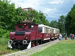 The Buckower Kleinbahn is a 4.9-kilometre (3.0 mi) spur line of the Prussian Eastern Railway, located in the Märkische Schweiz Nature Park in Brandenburg. It was originally constructed in 1897 as a narrow-gauge railway, with a gauge of 750 mm (2 ft 5+1⁄2 in), connecting Buckow to the Müncheberg (Mark) station. This line was electrified and changed to standard gauge in 1930. It has operated as a heritage railway since 2002.