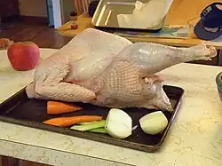 A heritage turkey prepared for roasting. Note the ratio of breast meat to dark meat is closer to 50/50.