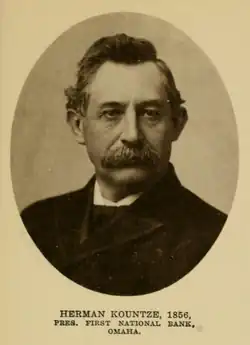 Herman Kountze (August 21, 1833 – November 20, 1906) was a powerful and influential pioneer banker in Omaha, Nebraska, during the late 19th century. After organizing the Kountze Brothers Bank in 1857 as the second bank in Omaha,[1] Herman and his brothers Augustus, Charles and Luther changed the charter in 1863, opening the First National Bank of Omaha that year.[2] Kountze was involved in a number of influential ventures around Omaha, including the development of the Omaha Stockyards and the Trans-Mississippi and International Exposition of 1898.[3] Immediately after his death Kountze was regarded as one of Omaha's "old settlers".[4] Today Kountze's First National Bank is the oldest bank west of the Mississippi River,[5] and continues as a privately held company in its sixth generation of family ownership.[6]
