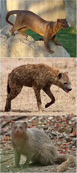 Top to bottom: Fossa, spotted hyena, Indian grey mongoose