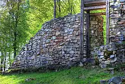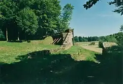 The northeastern flank was guarded by a 2.6-metre-wide, 3.5-metre-high and 110-metre long wall made of sandstone. This was in turn protected by a 3.5-metre-wide berm and a shallow ditch The wall on the inner side of the pincer gateway is only of single-leaf construction. The outer wall either side of the gateway approach on the hillside, was 2 metres wide and continued as a 55-metre-long wooden defensive breastwork. This probably enclosed the entire site. The gateway had a 1-metre-wide portal at the rear with a projecting wooden tower.