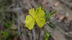 Hibbertia monogyna is an erect shrub that typically grows to a height of up to 60 cm (24 in) and is more or less glabrous. The leaves are linear to wedge-shaped or spatula-shaped, 5–12 mm (0.20–0.47 in) long, 2.5–5 mm (0.098–0.197 in) wide and sessile. The edges of the leaves curve downwards and there are sometimes teeth near the tip. The flowers are arranged on the ends of short side shoots and are sessile with a linear to lance-shaped bract about 1.5 mm (0.059 in) long at the base. The sepals are 4–6 mm (0.16–0.24 in) long, the lobes of unequal lengths and the petals are yellow, egg-shaped with the narrower end towards the base, 4–6 mm (0.16–0.24 in) long. There are ten to twelve stamens arranged around the single glabrous carpel. Flowering occurs in September and October.[2][3]